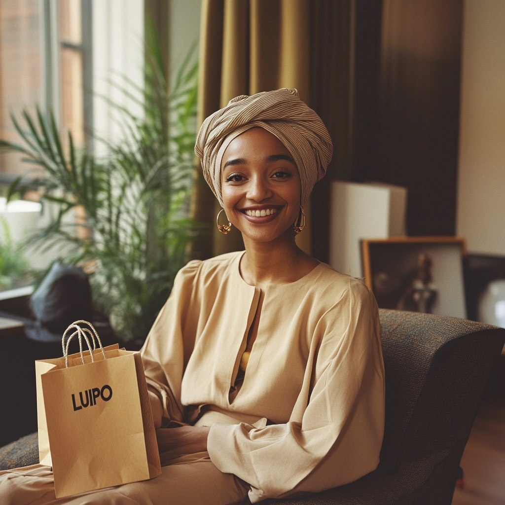 Создано на основе запроса: Make a cinematic scene. An Afro-descendant woman smiling, wearing a turban, about 35 years old, she is wearing minimalist clothing, blouse and pants. She is inside a studio. Behind her is the image of the living room of a solar house, with a window. In the studio, the woman is sitting in an armchair, holding a shopping bag with the words "LUPO" written on it. The house belongs to an artist. The environment is well lit. --- Автоперевод: Сделайте кинематографическую сцену. Как тебе иллюстрация? 🤔 https://dzen.ru/id/65c0c65c86e4f837c27b24d7 #ИИ #AI #нейросеть #midjourney #art