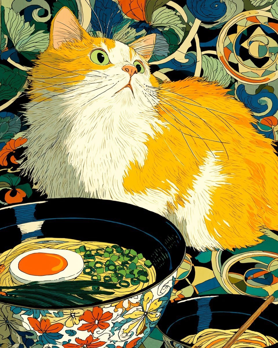 Создано на основе запроса: poster illustration of cat with ramen bowl --- Автоперевод: Плакат иллюстрация кошки с раменной чашей Как тебе эта генерация? 🤔 https://dzen.ru/id/65c0c65c86e4f837c27b24d7 #ИИ #AI #нейросеть #midjourney #art