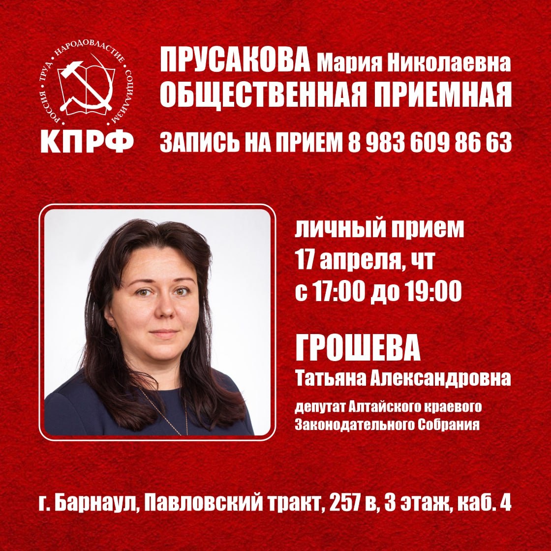 Приемные дни депутатов Алтайского краевого Законодательного Собрания по адресу: г. Барнаул, Павловский тракт, 257в, 3 этаж, каб. 4. 📌17 апреля, чт, 17:00 – 19:00, ГРОШЕВА Т.А., депутат АКЗС ☎️ Предварительная запись по тел. 8 983 609 86 63