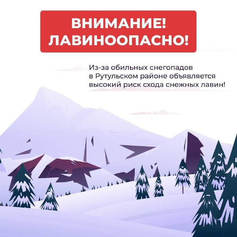 Экстренное предупреждение! Уважаемые жители и гости Рутульского района! По данным Гидрометцентра России, 15–16 апреля ожидается интенсивное выпадение мокрого снега, что значительно повышает лавиноопасность в горных районах. Наиболее опасная ситуация прогнозируется в Цахурской долине – возможны сходы снежных масс. Рекомендации: 🔹 Воздержитесь от поездок в горные районы. 🔹 Водителям – соблюдайте осторожность на автодорогах, возможны заносы и ухудшение видимости. 🔹 Жителям высокогорных сёл – будьте готовы к перебоям в работе дорог, запаситесь необходимым. Следите за официальными прогнозами и оперативными сводками МЧС. Берегите себя и своих близких!