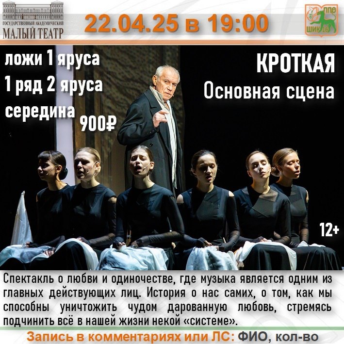 🎭 Спектакль «Кроткая» 📆 22 апреля в 19:00 🏛️ Малый театр, основная сцена 👛 Стоимость 900₽ 🎫 В наличии 8 билетов В спектакле заняты: народный артист России Сергей Гармаш; народный артист СССР, лауреат Государственных премий СССР и России Юрий Башмет; камерный ансамбль «Солисты Москвы»; артистки: Елизавета Долбникова, Анна Мадонова, Алёна Ревнёва, Ксения Меренкова; студенты ВТУ имени М.С.Щепкина. Режиссёр-постановщик, автор инсценировки и сценограф – В.М.Крамер 📝Запись в комментариях к посту или в ЛС до 15:30 18 апреля. ☎️Убедитесь, что Ваша заявка принята! Сообщите председателю ППО #МойТеатральныйМарафон #ПРОмалый #МалыйТеатр