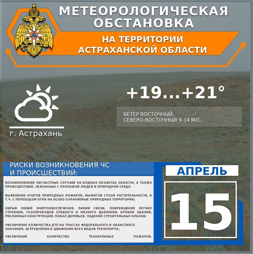 🌎Метеорологическая обстановка на 15 апреля. ⛅️На территории области переменная облачность. Без существенных осадков. Местами пыльная буря. Ветер 🌬восточный, северо-восточный 9-14 м/с, местами порывы 15-20 м/с. Температура воздуха +17...+22🌡°. 🌤По г. Астрахань переменная облачность. Без существенных осадков. Ветер🌬 восточный, северо-восточный 9-14 м/с. Температура воздуха +19...+21°🌡.