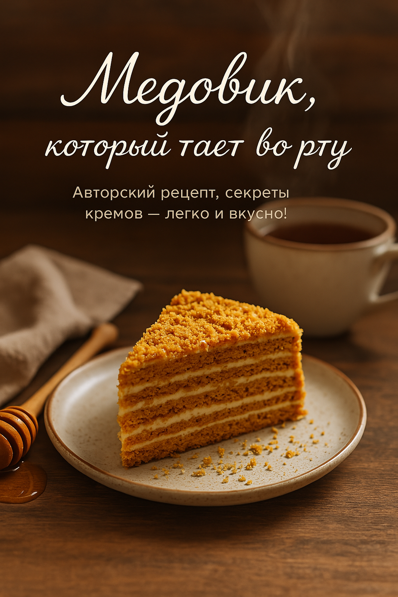 или 💛 Самый удачный рецепт, с секретами, кремами и душой Тысячи тортов появляются на свет, но медовик — это навсегда. Тёплый, как вечер с бабушкой. Простой, как первое «люблю». И, поверь, идеальный медовик доступен даже тем, у кого вместо духовки — мечта. Держи рецепт, выверенный сердцем и ложкой. Яйца — 2 шт Сахар — 150 г Мёд — 3 ст.л. (лучше цветочный) Сливочное масло — 80 г Сода — 1 ч.л. (без горки) Мука — 300–350 г (вводим по консистенции) 📌 Если нет мёда — можно заменить на тёмный сироп или патоку, но вкус будет другим. Лучше дождись мёда. 1. В кастрюле с толстым дном соединяем яйца, сахар, мёд, масло — ставим на водяную баню. 2. Помешивая, доводим до однородности. 3. Когда смесь станет гладкой и тёплой — добавляем соду. Пена, карамельный аромат — ты на правильном пути. 4. Снимаем, остужаем чуть и подсыпаем муку. Тесто должно быть мягким, тёплым, послушным. 5. Делим на 6–8 шариков. Каждый раскатываем на пергаменте тонко (можно вырезать по таре