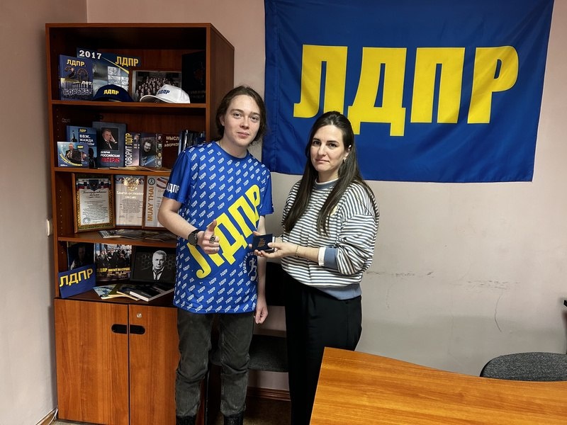 Координатор Сахалинского регионального отделения ЛДПР Ксения Баева вручила партийный билет активисту Артёму Спиридонову, который с раннего