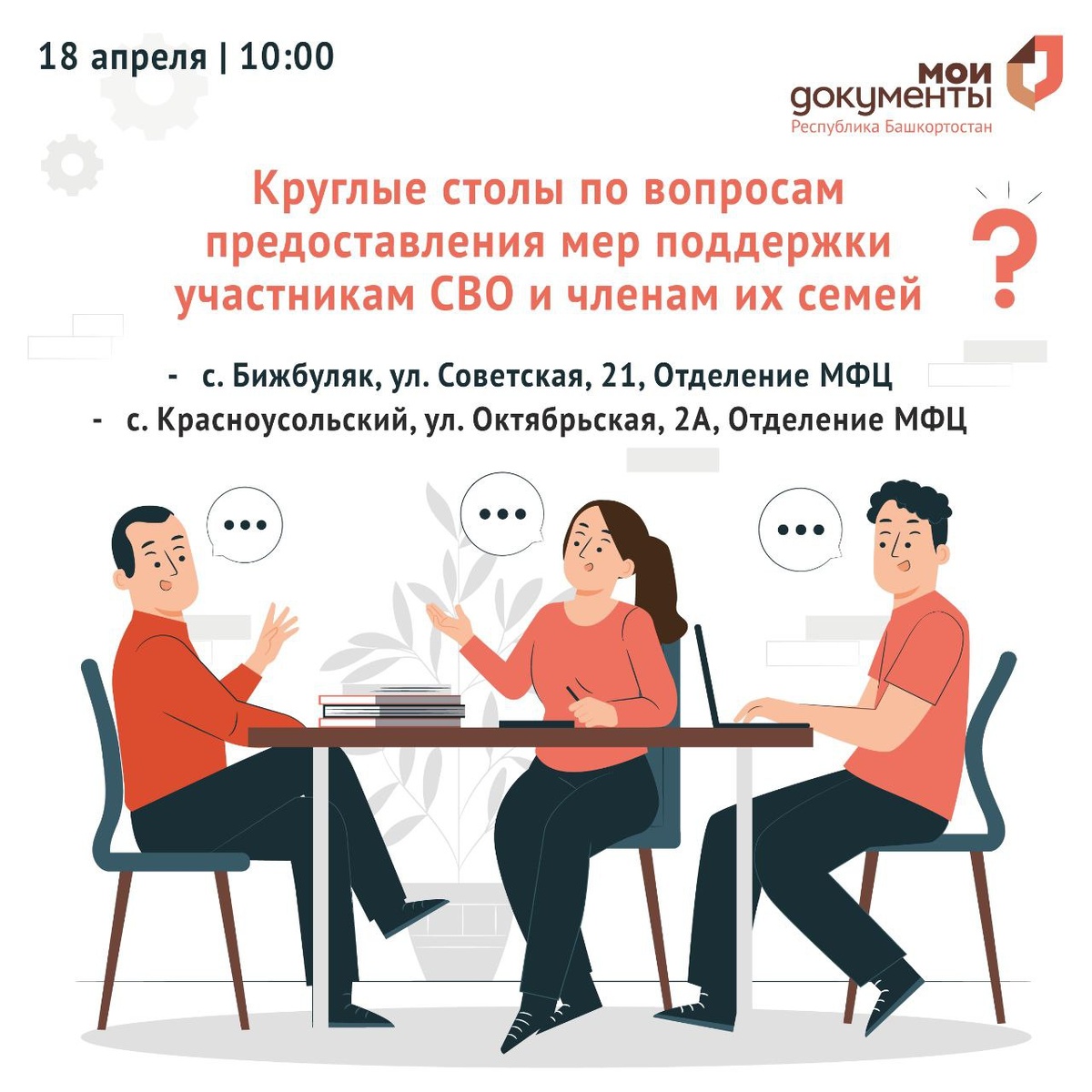 Круглые столы по вопросам предоставления мер поддержки участникам СВО и членам их семей У вас будет возможность: ⬜️получить ответы на все интересующие вопросы от специалистов ⬜️узнать о доступных мерах государственной поддержки для участников СВО и членов их семей Офисы МФЦ, в которых пройдут мероприятия: 🟢 с. Бижбуляк, ул. Советская, 21, Отделение МФЦ 🟢 с. Красноусольский, ул. Октябрьская, 2А, Отделение МФЦ 📆 🕘 Мероприятия пройдут 18 апреля, начало в 10:00 часов. #МФЦБашкортостана