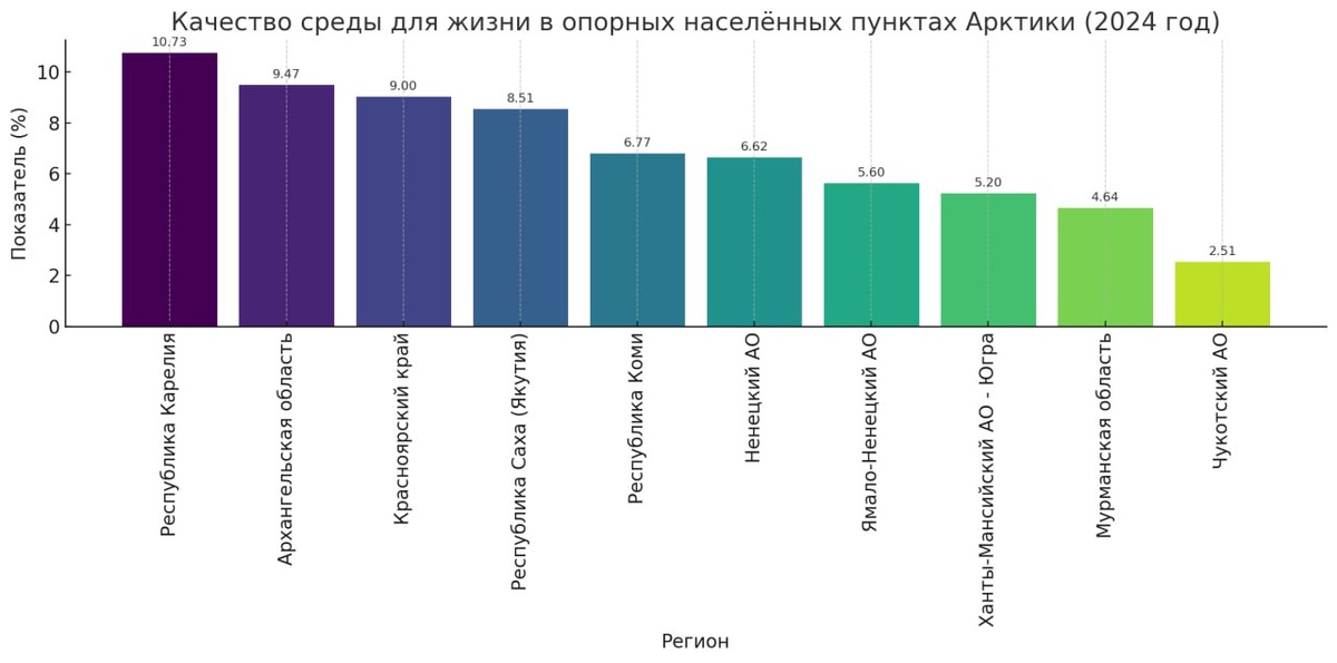 В ответ на пост Качество среды для жизни в опорных населённых пунктах Арктики по итогам 2024 года в среднем составляет 6,91%: значения варьируются от примерно 2,5% (Чукотка) до 10,7% (Карелия). Качество жизни в опорных населённых пунктах Мурманской области составляет 4,64% (9 место из 10). Отмечу, что этот показатель входит в методику расчета показателей для оценки эффективности деятельности высших должностных лиц субъектов РФ и деятельности исполнительных органов регионов. ❄ «Арктический Обозреватель»