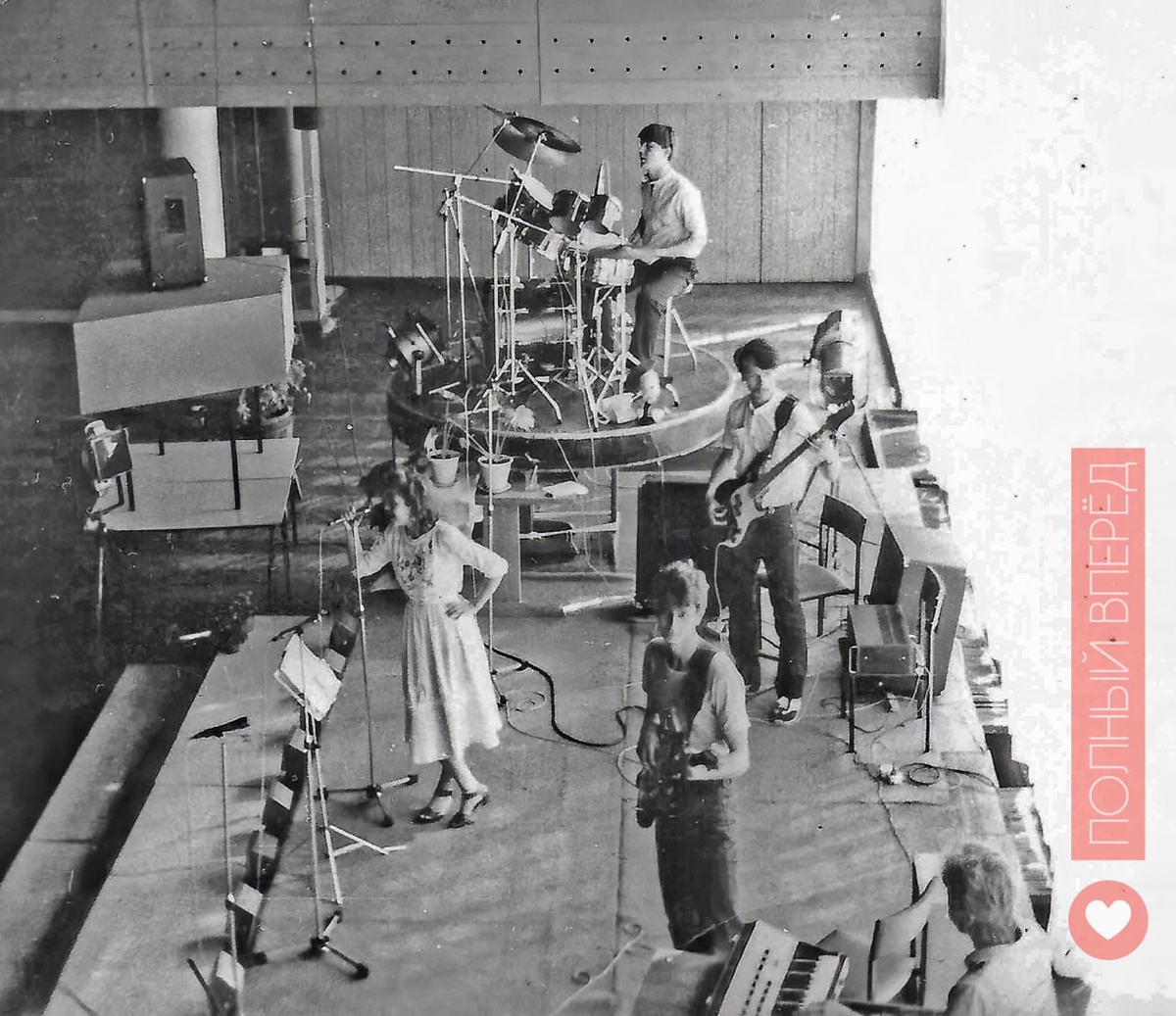 Архивный проект «Из потока воспоминаний» • Вокально-инструментальный ансамбль Полный вперёд • Зеркальный зал Межсоюзного дворца культуры им. Ленина • Первый концерт на только что построенной сцене, которую, по словам современников, дворцу передал театр Горького • Художественный руководитель ансамбля Феликс Павлович Аксельруд • Фото из архива Олега Баранова, он за барабанами • Владивосток • 1987-89