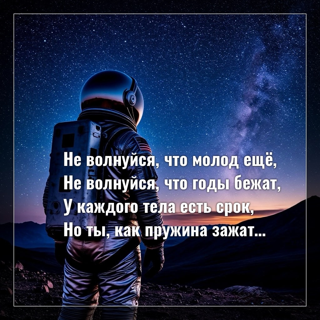 Не волнуйся, что молод ещё, Не волнуйся, что годы бежат, У каждого тела есть срок, Но ты, как пружина зажат, И думаешь, поздно уже, Так с ранних лет начинал Переживать обо всём, Что в себе в тот момент развивал. Память Души пробивалась, Странно было местами, Но люди вокруг тебя Скучать тебе не давали, Всё больше себя вспоминал И больше стремился к свободе, Присущей тонкому миру И звёздам на Небосводе. Небо всегда манило, Сколько же жизни там, Каждую летнюю ночь На Небе огни считал, И вспоминал, как было, В каком-то из воплощений, Легкость тебя манила, Скорость в сотни вращений, Но утро опять наступало, В реальность тебя возвращая, Нужно свой путь пройти здесь, Как бы Душа не скучала. Целуешь на небе Солнце, Мысленно благодаришь, Всё так же считаешь звёзды, Всё так же в мечтах молчишь, И так пролетает вечность, Вот уже тело другое, А Душа твоя помнит всё, И Землю и небо родное.