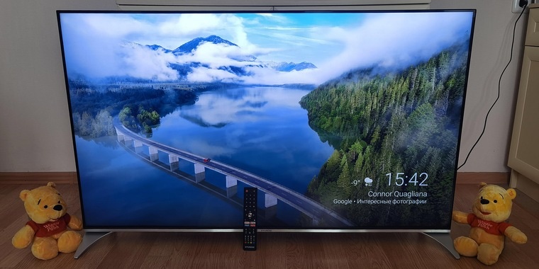 Модель порадовала дизайном с минимальными рамками и металлическими элементами. Квантовые точки и ряд других технологий позволили получить качественную и насыщенную картинку. Есть необходимый набор проводных и беспроводных интерфейсов, 5 ТВ-тюнеров и Bluetooth-пульт. Операционная система Android TV имеет проверенный временем интерфейс, поддержку большого числа форматов и сторонних приложений. Голосовой ассистент от Google поможет в управлении ТВ, произведет поиск или подскажет погоду. Модель имеет функцию записи трансляций PVR и поддерживает накопители формата NTFS, технология MEMC делает динамичные сцены более плавными, а «Игровой режим» снижает задержку. Есть возможность выбрать из четырех диагоналей, присутствует официальная гарантия в России. В целом, телевизор Hyundai H-LED55QBU7500 оказался весьма интересным решением за свои деньги.
