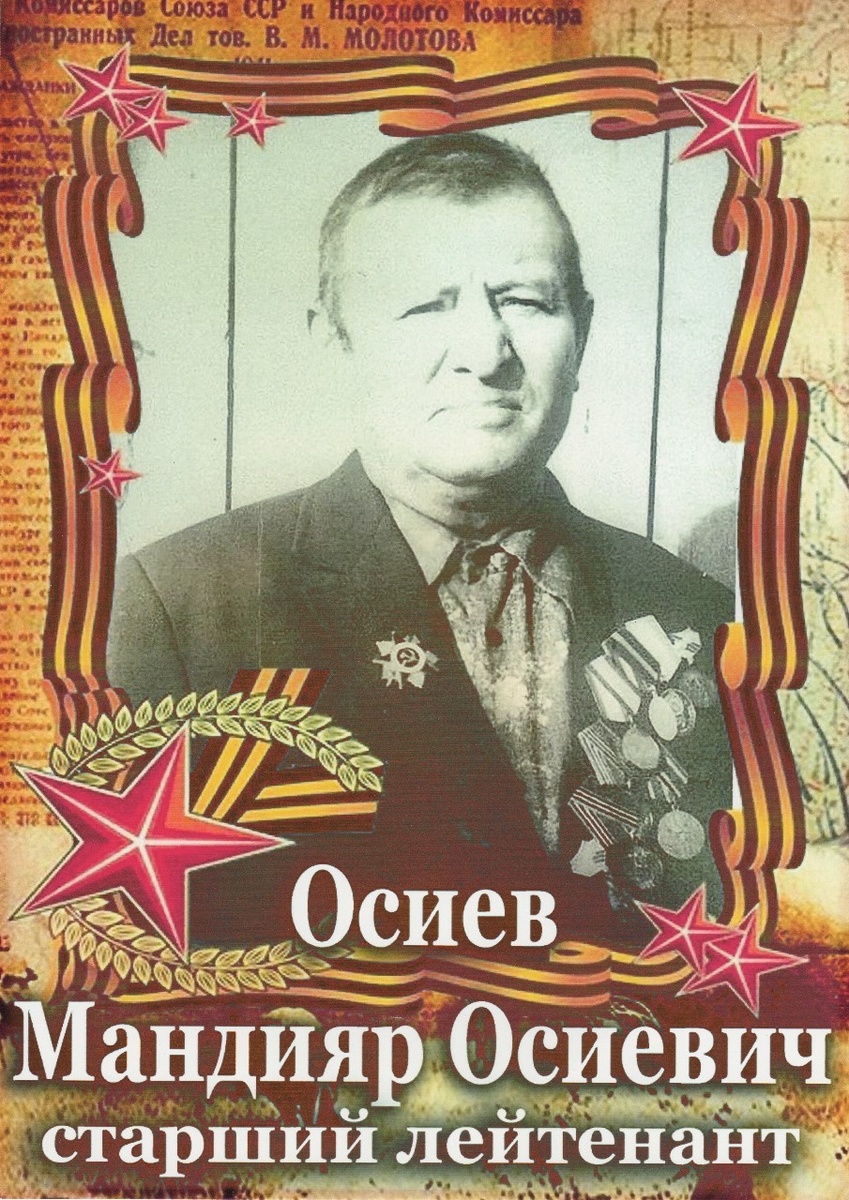 Мандияра Осиева и Андрея Аптыкова призвали на фронт 14 августа 1942 года. Моему дедушке Мандияру тогда было 17 лет. На лошадях отправились до города Бирска, оттуда в город Благовещенск (Республика Башкортостан) - на пароходе. Там он учился в Южно-Уральском пулемётном училище до марта 1943 года. Их ночью подняли по тревоге и пешком отправили на станцию Уфимской железной дороги. На дорогу дали всего 4 куска сухарей. В Москву они ехали в товарном вагоне. В сортировочной станции ждали трое суток. За это время покормили один раз. Дедушку направили на Воронежский фронт и разместили возле города Новый Оскол в лесу. Сами себе построили шалаши, прошли годовой курс обучения. Получив звание младшего лейтенанта, М. Осиев в течение 4 месяцев командовал взводом противотанкового орудия 1144 стрелкового полка 340 стрелковой дивизии. Впоследствии их полк был включен в I Украинский фронт. В то время наступали только ночью. Днём разведчики сообщали о расположениях немецких воинских частей. В