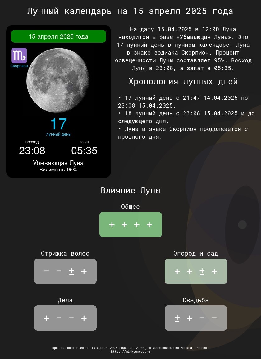 Лунные календари на 15 апреля 2025 года: Подготовьтесь к этому дню с учетом влияния Луны
