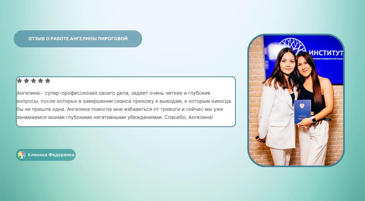 Отзыв клиента о работе с психологом Клиники когнитивной психотерапии Федоренко - Пироговой Ангелиной Сергеевной