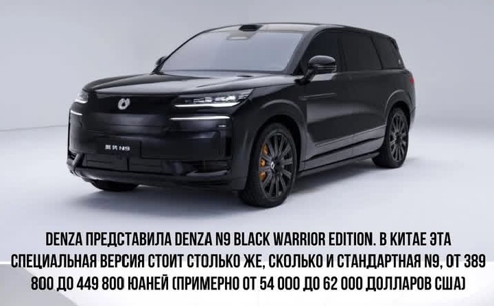 Denza N9 PHEV Black Warrior Edition: Китайский Внедорожник-Супергибрид с 925 л.с. и Запасом Хода 1300. Новая Эра Мощности и Экологичности Китайский авторынок продолжает удивлять мир: бренд Denza, совместное предприятие BYD и Mercedes-Benz, представил свой флагман — внедорожник **N9 PHEV Black Warrior Edition**. Эта модель не просто бросает вызов традиционным лидерам вроде Land Rover и Tesla — она переписывает правила игры. С мощностью **925 л.с.** и запасом хода **1300 км**, Black Warrior Edition сочетает в себе силу, роскошь и экологичность, став символом технологического прорыва Китая. Технические Характеристики: Рекордные Показатели: -Супергибридная установка: Два электродвигателя и турбированный ДВС работают в тандеме, обеспечивая 925 л.с. и разгон до 100 км/ч за 3,8 секунды. - Революционный запас хода: Благодаря батарее 45 кВт·ч и интеллектуальной системе распределения энергии, N9 преодолевает 1300 км без подзарядки (из них 200 км — на чистой электротяге). - Полный привод