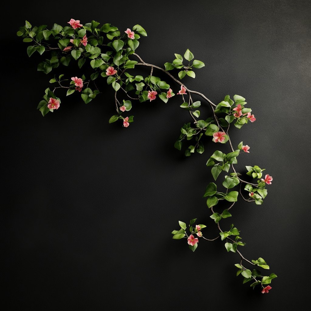 Создано на основе запроса: A realistic image of a lush green vine crawling across a matte black wall, with elegant Singaporean orchid flowers blooming along its length. The vine has graceful, organic curves with small tendrils, and the orchid blossoms appear in shades of soft red, pink, and white, vividly standing out against the dark background. The lighting is moody but clear, subtly illuminating the flowers and vine to enhance texture and depth. Botanical, refined, and dramatic ideal for upscale branding or visual display. --- Автоперевод: Реалистичное изображение пышной зеленой лозы, ползающей по матовой черной стене, с элегантными сингапурскими цветами орхидеи, расцветающими по ее длине. Как тебе вариант? 🤔 https://dzen.ru/id/65c0c65c86e4f837c27b24d7 #ИИ #AI #нейросеть #midjourney #art