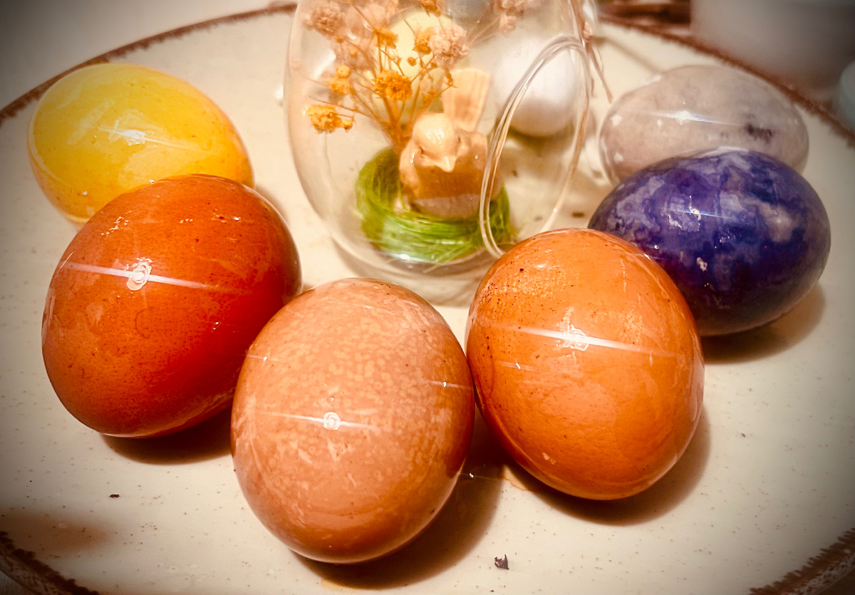 Вот такие яйца у нас получились. Да, может они для кого-то не идеально окрашенные, но все мы участвовали в этом процессе окрашивания, пробовали, экспериментировали. И мы любим, когда они разной текстуры.