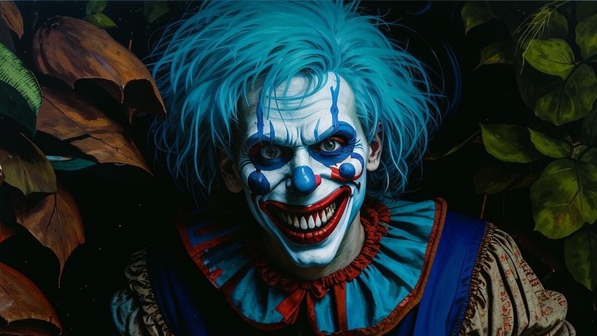 Внезапно из-за деревьев вышел он. Клоун. Синие волосы торчали во все стороны. Гладкая белая кожа сияла в лунном свете, а зловещая улыбка растягивалась до ушей. Он был одет в яркий костюм. Что-то в его глазах выдавало безумие.