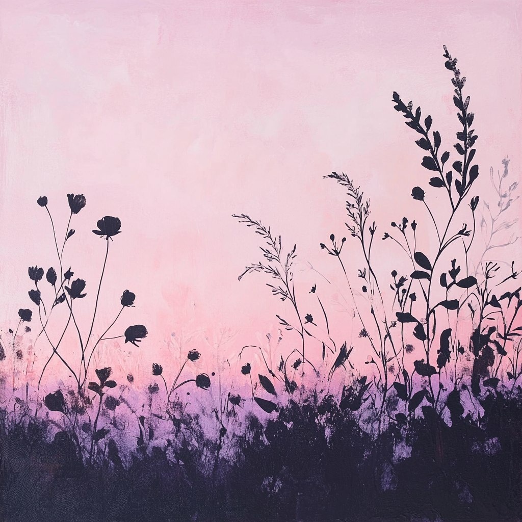 Создано на основе запроса: minimalist wildflower meadow at twilight, painted in soft pastel pink and purple tones with hints of black and