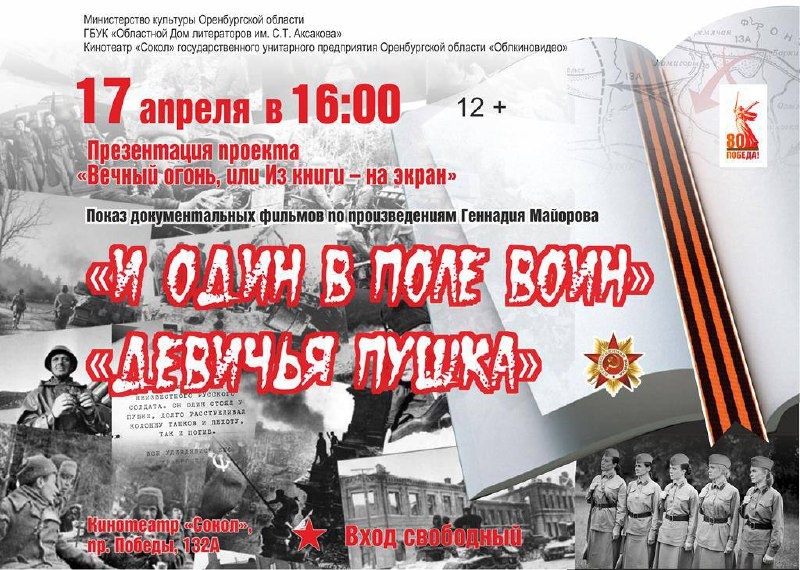 Оренбуржцев приглашают на показ фильмов о войне 17 апреля в 16:00 в кинотеатре «Сокол» пройдёт презентация проекта «Вечный огонь» с участием писателя Геннадия Майорова и поэтессы Наталии Елизаровой. В основе – книги и документальные фильмы о подвигах советских солдат. 📽 Фильмы к показу: «И один в поле воин» (12+) – о подвиге Николая Сиротинина, в одиночку сдерживавшего танковую колонну. «Девичья пушка» (12+) – история женского расчёта, подбившего 4 танка. 📖 Встречи с авторами: 18 апреля в 15:00: Библиотека им. Некрасова – Геннадий Майоров Библиотека им. Ямашева – Наталия Елизарова Вход свободный.