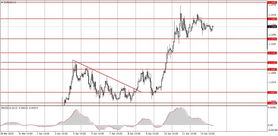 https://basechop.ru/wordpress/?p=38477 Разбор сделок понедельника: 1Н график пары EUR/USD. Валютная пара EUR/USD в понедельник торговалась уже больше вбок, чем вверх, хотя по итогам дня все равно подорожала. В понедельник никаких важных макроэкономических или фундаментальных событий не было запланировано ни в ЕС, ни в США, а рынками продолжал править Дональд Трамп. Он сделал анонс новых пошлин на импорт, на этот раз на импорт полупроводников. Эти пошлины еще не введены, но они фактически нивелируют весь положительный эффект от «налоговых каникул» для «черного списка», который Трамп ввел на 90 дней. По сути, Трамп одни пошлины вводит, вторые замораживает, но Мировая торговая война продолжает эскалировать. Таким образом, рынок остается в состоянии паники и хаоса, движения рэндомные, цена очень часто меняет направление движения. 5M график пары EUR/USD. На 5-минутном ТФ в понедельник было сформировано несколько торговых сигналов. Всю европейскую торговую сессию цена торговалась вбок, н