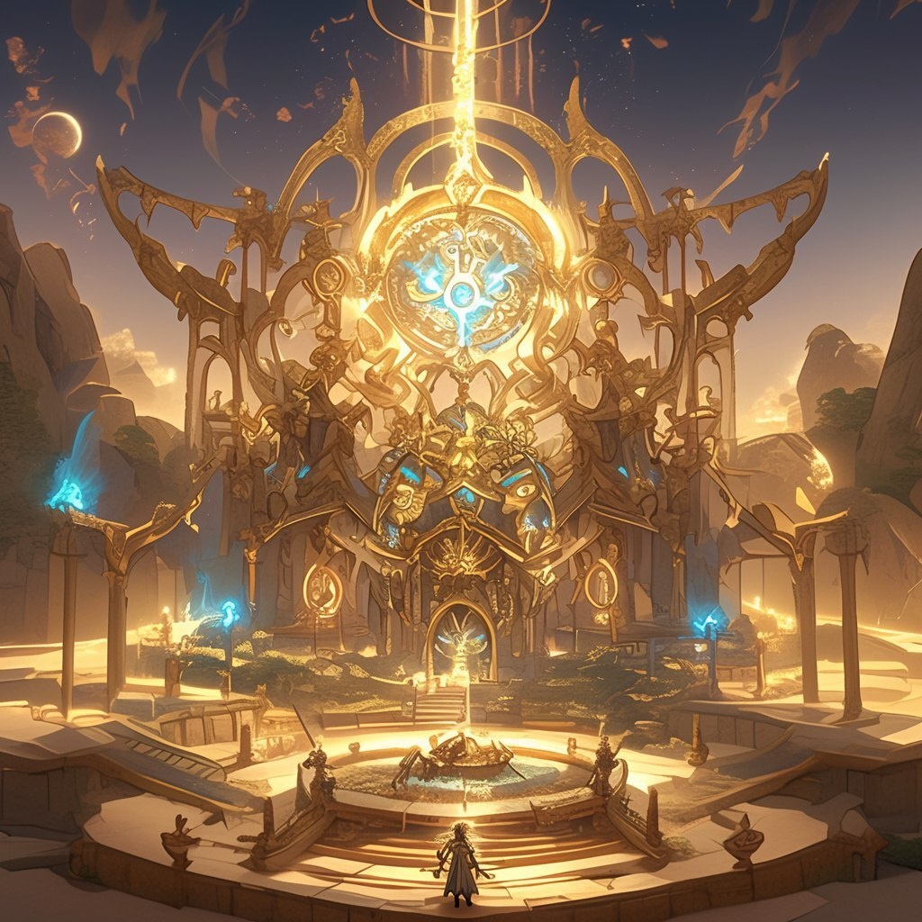 Создано на основе запроса: A golden fantasy temple glowing with radiant divine energy, encrusted with jewels and ancient symbols