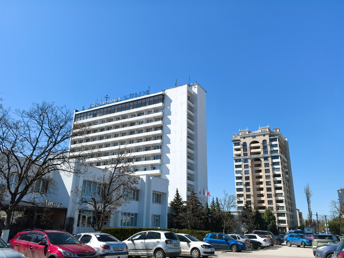 Выходим на остановке «Площадь Восставших». Здесь видно здание гостиницы «Крым»: