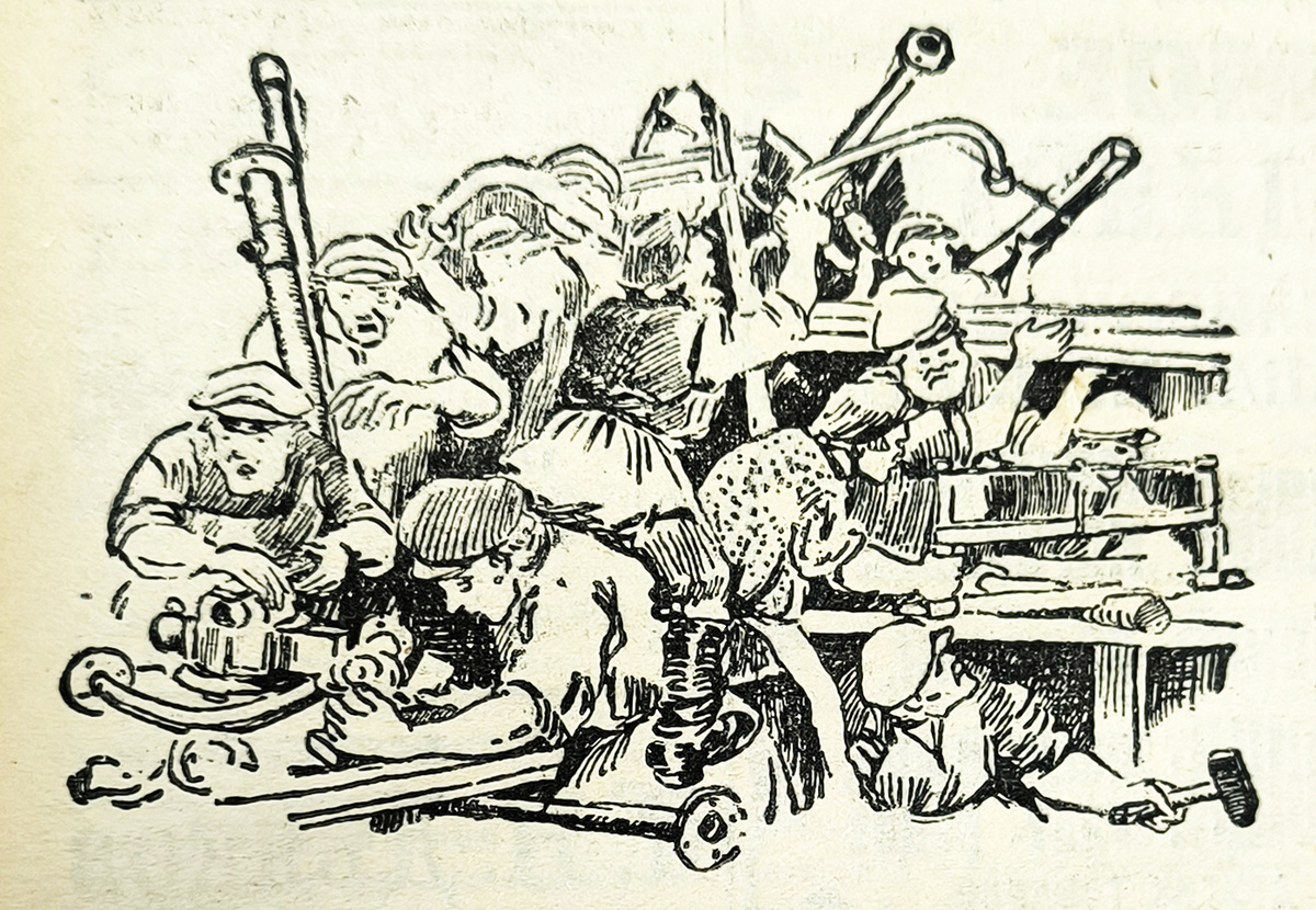 Газета «Коммунар», ежедневный орган Губкома РКП(б) и Губисполкома Советов рабочих, Крестьянский и Красноармейских депутатов Тульской губернии, № 86 (2018) от 15 апреля 1925 года. — Ребят, опять проход досками завалили, с материалом не пройти. — А ты сбоку пролезь. — Трубы мешают. Опять разбился… Чтоб их… Такие разговоры услышишь у нас в паро-нефте-проводной механической № 2 мастер. Оружзавода. В одном помещении помещаются паро-нефте-проводный, плотницкий и столярный, да кисельмановский цехи. А водопроводному ни повернуться, ни шагу сделать. Слесаря железо натащат, плотники досок, водопроводчики труб — проходов и не останется. А ходить надо. Слесаря трое на одном, водопроводчики — 20 на одном верстаке работают. Очередь становится, работа задерживается. Горна в мастерской нет. С каждой трубой нагревать по двору к ножному горну беги, да и гнуть на дворе приходится — в мастерской не повернешься. Еще в прошлом году поднимали рабочие вопрос об устройстве всех нужных для цеха приспособлений —