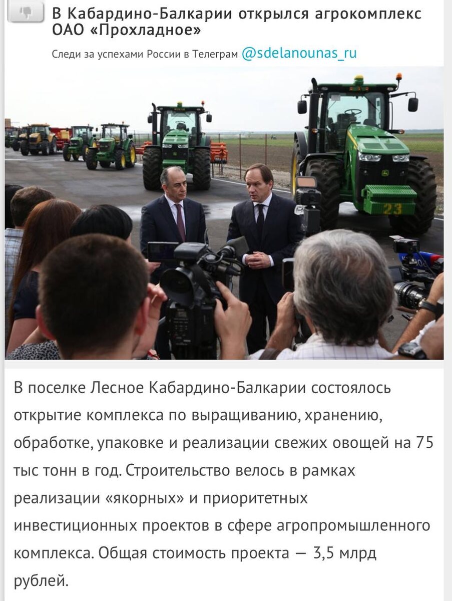 За 730 млн выставлено на продажу имущество признанного банкротом ОАО «Прохладное» из Кабардино-Балкарии. В 2015 его с помпой открыли глава КБР Юрий Коков и министр по делам Северного Кавказа Лев Кузнецов. Показывал предприятие гостям бизнесмен Хасан Дешев. «Технологическая линия производства предполагает выращивание, хранение, обработку, упаковку и реализацию свежих овощей. Мощности комплекса достигают 75 тыс. тонн в год. Этого достаточно для обеспечения потребности жителей республики и других субъектов, входящих в состав СКФО», — писала официальная пресса. «Прохладное» тогда же назвали «одним из 39 «якорных» и приоритетных инвестиционных проектов в АПК, направленных на решение проблем импортозамещения». @gazetayuga