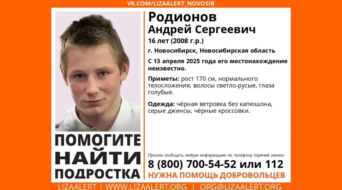 В Новосибирске волонтеры ищут 16-летнего Андрея Родионова с голубыми глазами. Мальчик пропал в воскресенье, 13 апреля, сообщает ЛизаАлерт. Приметы пропавшего: светло-русые волосы, нормальное телосложение, рост 170 см. Известно, что пропавший был одет в черную ветровку без капюшона, серые джинсы и черные кроссовки. Поисковый отряд обращается к добровольцам за помощью в поисках Андрея Родионова. «Если вам что-либо известно о местонахождении пропавшего подростка, сообщите, пожалуйста, по телефону горячей линии отряда 8-800-700-54-52 (круглосуточно, бесплатно) или по номеру 112«, — добавили волонтеры. Ранее мы писали о том, что пропавший в марте школьник был найден мертвым. Александра Моисеева