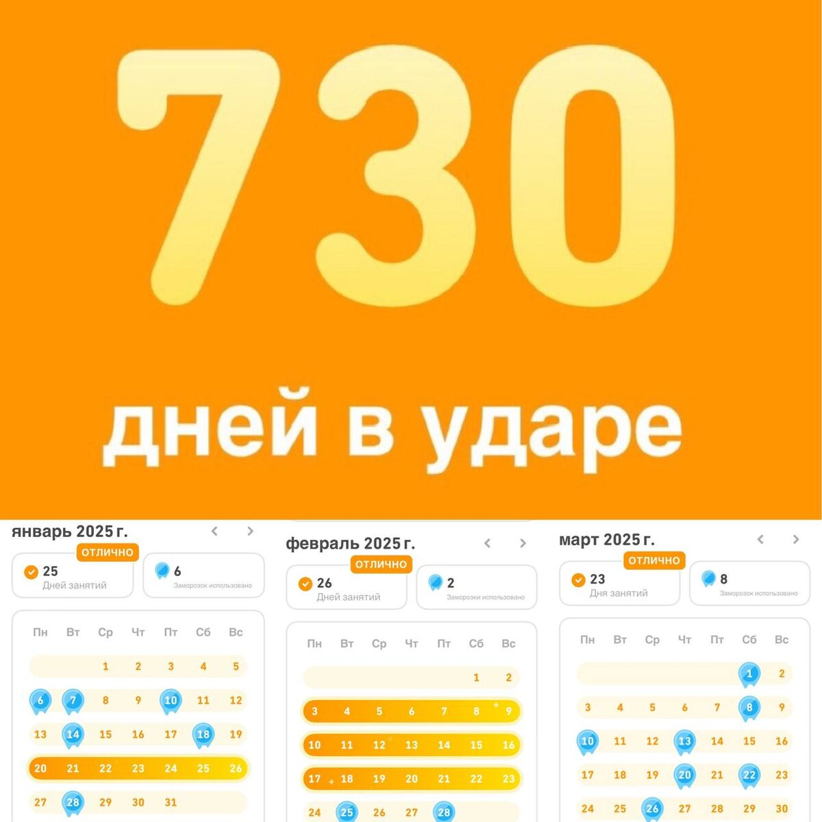 Есть ли у меня мотивация учить английский? Да не особо. За предыдущие 730 дней она то увеличивалась, то спадала в ноль. Поэтому я больше не фокусируюсь на поиске мотивации. Я фокусируюсь на дисциплине. И вот что я понял за эти 730 дней дисциплинированных маленьких шагов: 1. Всего 10 минут в день меняют жизнь. Гораздо проще уделить чему-то 10 минут в день «на силе воли», чем искать мотивацию заниматься спортом по часу в день. Для начала этого и не нужно. Начинать внедрять новую привычку или новый навык нужно по 10 минут в день. Мало, но постоянно — лучше редкого, но большого рывка. Секрет не в объёме, а в постоянстве. 2. До новой привычки гораздо больше чем 21 день. Заходить в Дуо на автомате, не тратя туда сил на обдумывание (сейчас или потом) и не потратив туда силу воли у меня получилось где-то через пол-года. А через 290 дней это встроилось в мою рутину дня. После этого я стал открывать приложение на автомате: в очереди, в такси, в туалете (куда же без него). Мой палец сам нажимает