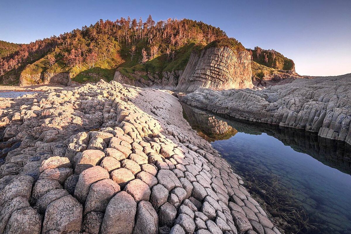 Мыс Столбчатый Курильские острова Мыс славится своими базальтовыми колоннами – впечатляющим геологическим образованием. Колонны достигают десятков метров в высоту. Их правильная геометрическая форма – результат медленного остывания древней лавы. Это уникальное место, аналогов которому немного в мире. Экскурсии к Мысу Столбчатому требуют хорошей физической подготовки и специального снаряжения, так как погодные условия могут быть непредсказуемыми. Добраться до мыса можно только по морю, в составе организованных туристических экспедиций. Самостоятельное посещение практически невозможно.