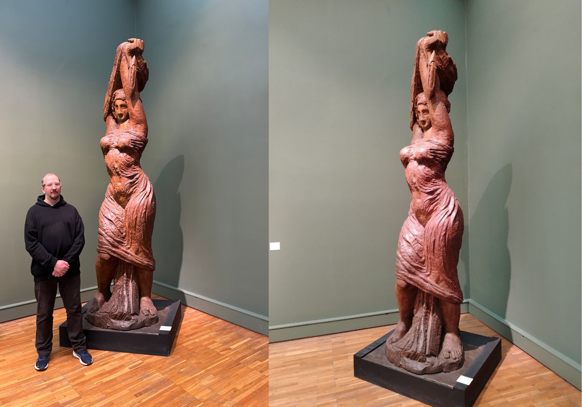 Но сейчас я бы хотел написать об одном увиденном экспонате - деревянной скульптуре «Текстильщица» Сергея Тимофеевича Конёнкова. Её размер - почти 5 метров. Я со своими 193 см на её фоне смотрюсь, как пигмей)))