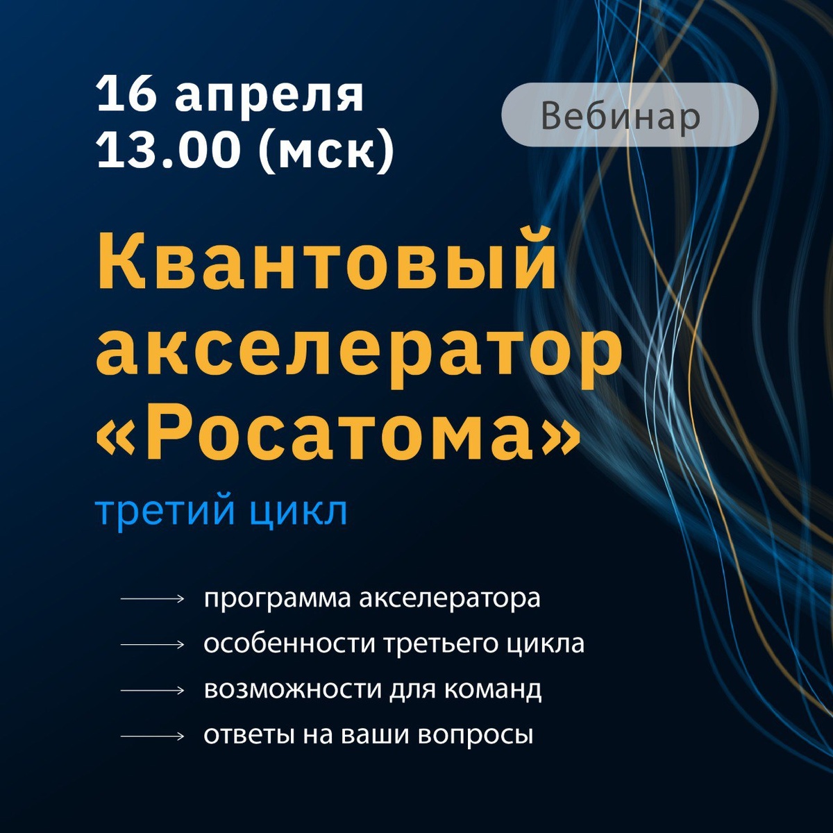 🚀 Квантовый прорыв начинается здесь Ученые, стартапы и новаторы — присоединяйтесь к вебинару «Квантовый акселератор Росатома. Старт третьего цикла» 🗓 16 апреля | ⏰ 13:00 МСК 🔗 Подключиться Что вас ждет? ✅ Подробности о третьем цикле акселератора, расскажем о приоритетных направлениях и условиях участия. ✅ Поделимся информацией о мерах поддержки для развития проектов, предусмотренных программой ✅ Возможность задать вопросы организаторам Акселератора ⚠️ Кстати, мы продлили регистрацию на Квантовый акселератор «Росатома» до 22 апреля, а это значит, что вы можете не просто прослушать вебинар, но и подготовиться к участию в Акселераторе и уже в ближайшее время начать работу над своим проектом. Все подробности программы и регистрация на акселератор можно найти по ссылке.