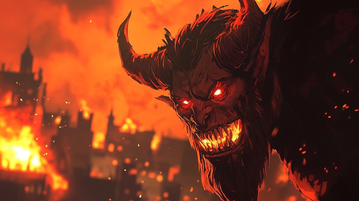 Создано на основе запроса: an dark fantasy epic scene of an Demon with fire horns and red skin, he is looking at us with an scary look, he