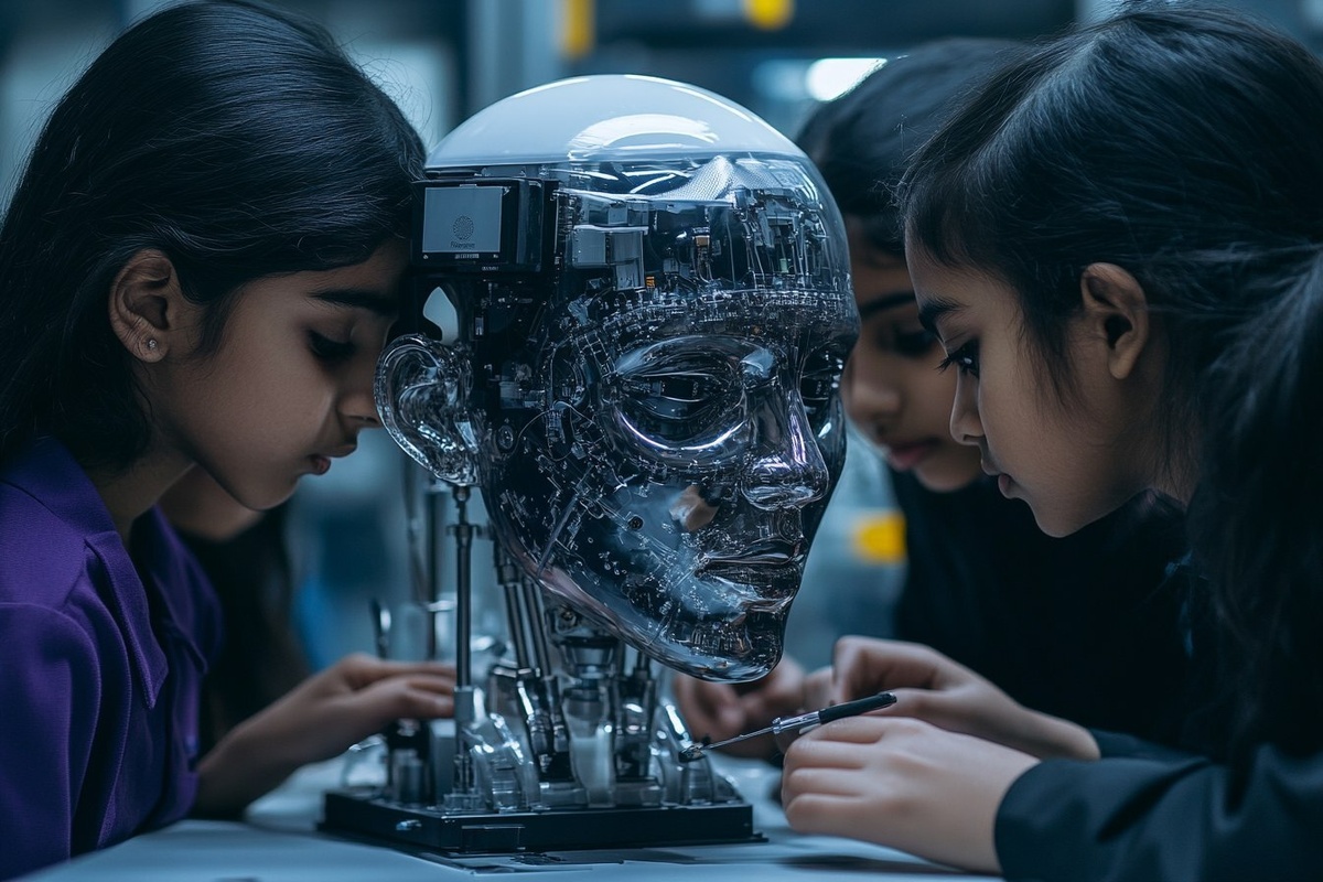 Создано на основе запроса: a group of professionaly looking indian and middle east school kids wearing lavender tshirt and black coat uniform and fixing a humanoid robot's head in a futuristic lab --- Автоперевод: Группа профессионально выглядящих школьников индийского и ближнего востока в лавандовой футболке и форме черного пальто и фиксирующих головы гуманоида в футуристической лаборатории Как тебе иллюстрация? 🤔 https://dzen.ru/id/65c0c65c86e4f837c27b24d7 #ИИ #AI #нейросеть #midjourney #art