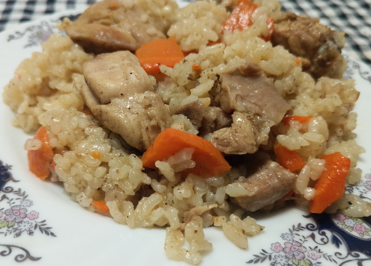 Жареная курица с овощами - это блюдо, которое понравится любителям азиатской кухни. Оно готовится очень просто и быстро. Для его приготовления вам понадобятся следующие ингредиенты. Курица (около 1,2 кг) Морковь - 2 шт Лук - 1 шт Рис - 1,5 стакана Масло растительное - 60 мл Соль по вкусу Специи по вкусу Нарежьте курицу на кусочки. Обжарьте на растительное масле до золотистой корочки. Нарежьте лук Морковь нарежьте по крупнее. Добавьте нарезанный лук и морковь, обжарьте до мягкости. Добавьте рис и обжаривайте до до золотистого цвета. Добавьте воду примерно три стакана и доведите до кипения. Посолите и добавьте специи, чёрный перец, приправа, паприка, чеснок сушёный, лавровый лист, перец горошком. Уменьшить огонь и готовить под крышкой до готовности риса и курицы. Жареная курица с морковью, луком и рисом готова! Подавайте её горячей и наслаждайтесь её вкусом. Это блюдо прекрасно сочетается с салатами из свежих овощей и зеленью. Приятного аппетита!
