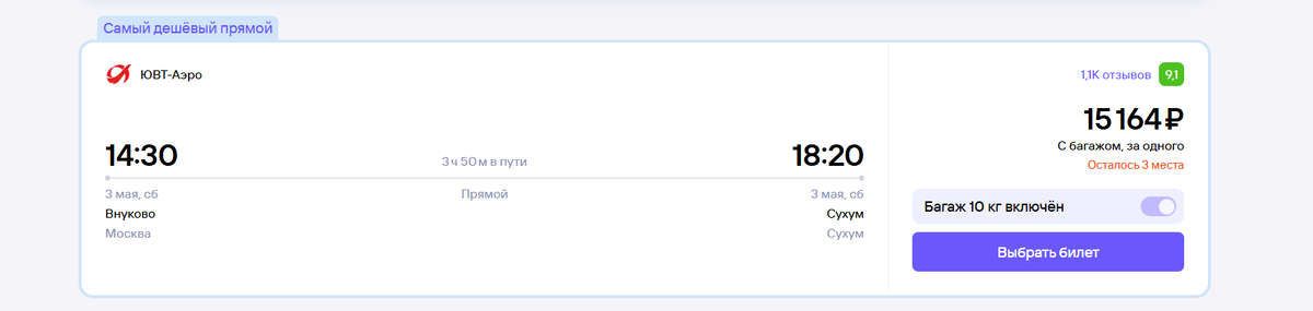 Министерство транспорта России объявило о старте продаж билетов на рейсы в Абхазию. Первый авиарейс по маршруту Внуково–Сухум запланирован на 3 мая — его выполнит авиакомпания «ЮВТ АЭРО», борт Bombardier CRJ100/200, а 6 мая начнутся полеты компании "Икар" из Нижнего Новгорода. "По результатам работы, проведенной Минтрансом и Росавиацией совместно с российскими авиаперевозчиками, открыты продажи авиабилетов на рейсы в Сухум", - сообщается в Telegram-канале Минтранса. Почему стоит выбрать этот рейс?