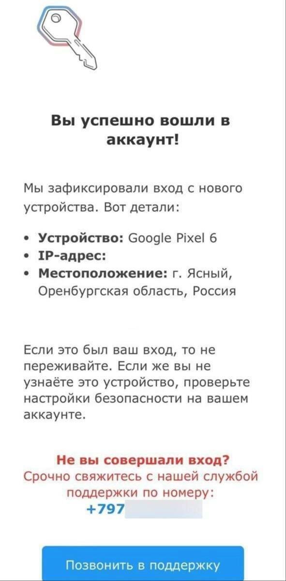 Жители России, в том числе Ленинградской области, начали массово получать фальшивые письма, якобы от портала Госуслуг, с уведомлением о попытке входа в аккаунт с неизвестного устройства. Сообщения приходят с поддельного адреса, в котором название сервиса указано с ошибкой — Gos uslugi. Внутри письма содержится ложный номер службы поддержки. Позвонив по нему, человек попадает на мошенников, которые под предлогом проверки начинают собирать реальные данные для входа в личный кабинет. Получив доступ, злоумышленники могут завладеть доступом к финансам жертвы. 👉🏼Подпишись