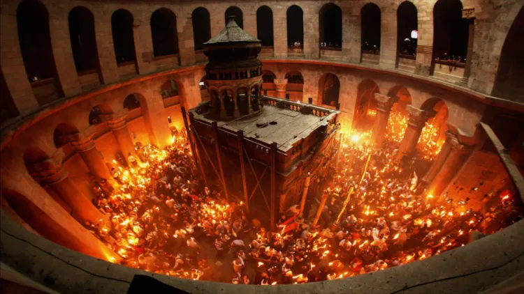 Паломники в храме Гроба Господня, где Иисус был распят, похоронен и воскрес из мертвых, держат свечи, толпясь на церемонии схождения, стараясь своими глазами увидеть чудо. Церемония каждый год транслируется по телевидению во многих странах мира. И в этом году церемония пройдет 4 мая, ее можно будет увидеть с 13:00 до 16:00 по Москве.