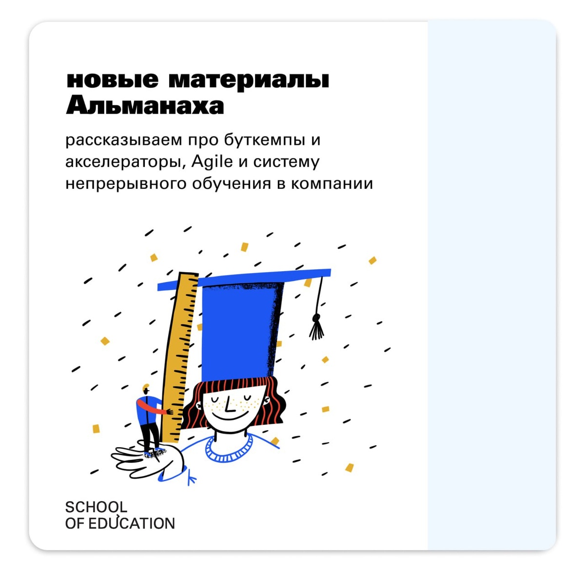 Что почитать? Новые материалы Альманаха Статьи для педагогов, методистов, продакт-менеджеров и лидеров образовательных организаций Мы опубликовали новые материалы в Альманахе School of Education: рассказали про новые форматы обучения, как внедрять Agile-методы в образовании и выстроить систему непрерывного обучения в компании. Приятного чтения! Новые форматы обучения: корпоративные университеты, акселераторы и буткемпы Современные образовательные потребности постоянно меняются, и традиционные методы обучения уже не всегда соответствуют требованиям рынка труда. Новые форматы обучения, такие как корпоративные университеты, акселераторы и буткемпы, помогают быстро адаптироваться к изменениям, повышать квалификацию сотрудников и обучать востребованным навыкам. Рассмотрим особенности каждого из этих форматов. Как внедрять Agile-методы в образовательные процессы? Agile (гибкие методы управления) давно зарекомендовал себя в сфере IT и бизнеса, но его принципы можно эффективно применять и