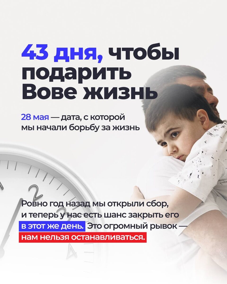 ЭКСТРЕННЫЙ И МАСШТАБНЫЙ СБОР! Я молю Вас сделать рывок и закрыть сбор до 28 мая.🙏🏻 В этот день ровно год назад мы открывали сбор, что будет «завтра» не скажет ни один врач и если не успеть, Вова окажется в инвалидном кресле, а дальше летальный исход. ⏳43 дней 👥248 261 человек по 500 руб 🚨 или любая посильная сумма Сейчас на счету каждый день. Вова Соловьев, 8 лет, Диагноз: Миодистрофия Дюшенна. Все документы, фонды и перевод с зарубежных карт по ссылке в описание @savevova2024 Сумма сбора: 262 000 000руб. Осталось собрать: 124 130 296руб НАМ НУЖНА ПОДДЕРЖКА ЛЮДЕЙ!🙏🏼 Отправьте это видео своему другу, выставите в статусы WhatsApp и телеграмм. Реквизиты: Перевод по номеру тел.+7(918)499-99-81 Заира Масхудовна С. (Мама) СБЕР: 2202 2080 9980 3240 БКС: 2203 6203 2117 2591 В комментариях к платежу: Вове на лечение.