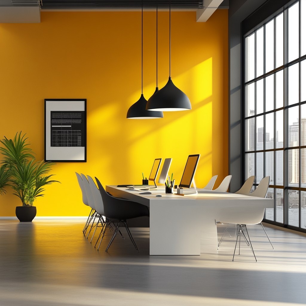 Создано на основе запроса: Create a sleek, minimalist office space showcasing harmonious color scheme, modular furniture, and personalized