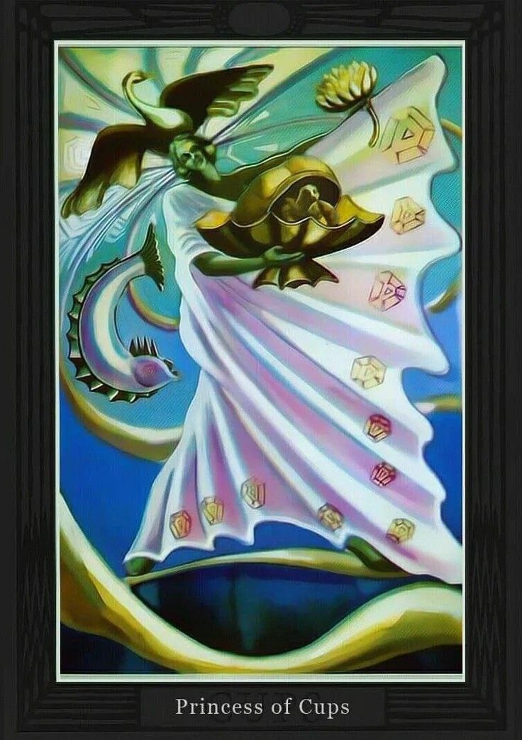 #анализируясны После того сна с анимой пошла целая серия принцесс. В одном сне я сам был принцессой, рожденной(созданной, но говорилось "рожденной") двумя монахинями в башне. Я существовал для того, чтобы мир вокруг начинал жить, становился красивее, чтобы раскрывать его. Сегодня во сне люди, выжившие в зомби-апокалипсисе послали меня в прошлое, чтобы найти принцессу и привести в нужный момент к ним. Без неё нет шанса возродить землю, без неё будет медленное увядание. Я привожу её среди прочих людей и понимаю, что она-часть меня самого. На картинке принцесса кубков "таро Тота" Кроули. Совпадает с мои ощущением.