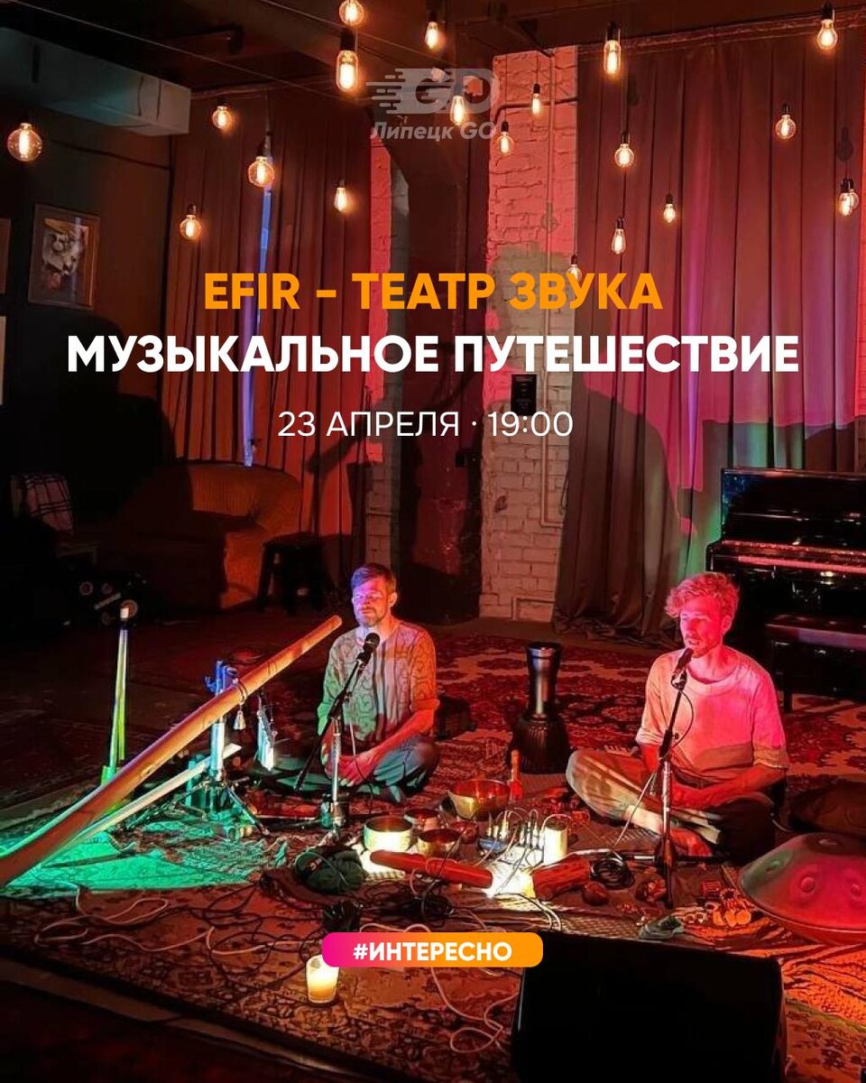 Приглашаем вас в музыкальное путешествие с музыкантами проекта - Efir - Театр Звука. 23 апреля в 19:00 концерт пройдет в пространстве Библиотека на Октябрьской, 28. Концерт Efir - это непрерывный поток живой музыки более чем на 50 древних и современных музыкальных инструментах! Он рождает у каждого слушателя свой собственный театр с яркими образами, фантазиями и ощущениями. А после концерта - ощущение полной перезагрузки, как после яркого путешествия! Живая музыка, рожденная из сердца людей, любящих природу, людей и отдавших себя полностью своему предназначению. 📅 Когда: 23 апреля в 19:00 📍 Локация: Библиотека. Липецк, Октябрьская, 28 🖼 Билеты и подробности 😀😃😄😁 - ваш путеводитель досуга