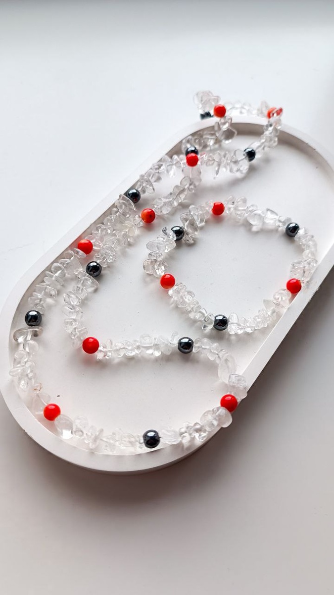 Колье и браслет из #горногохрусталя, #коралла и #гематита