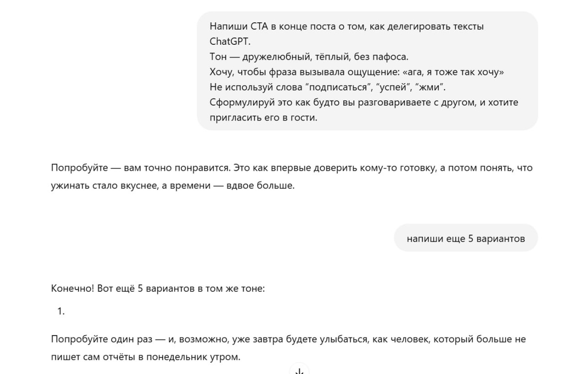 Вы наверняка это видели. Или даже сами писали. Внизу поста — что-то вроде: «Подпишитесь, чтобы не пропустить» «Успей, пока доступ открыт» «Жми кнопку» И всё бы ничего, но... Человек дочитал до конца, в нём только-только настроился ритм, а вы ему — как будто хлопнули дверью перед носом. CTA — призыв к действию — это не приказ, не щелчок по носу. Это выдох в нужный момент. Он не должен быть заметен. Он должен быть как логичное продолжение дыхания, когда человек уже почти сказал «да» — и вы мягко протягиваете руку. Хороший CTA — это не кнопка, это ощущение Плохой призыв к действию звучит, как голос диспетчера в метро. Хороший — как официант в уютной кофейне, который просто ставит перед вами пирожное и говорит: «Это новое. Только сегодня. Попробуйте». Он не уговаривает. Он предлагает продолжение того, что уже началось. Ошибки, которые ломают даже хорошее впечатление ❌ Вставлять CTA из шаблона, не считаясь с тоном текста ❌ Начинать давить: «Не упусти шанс! Подпишись прямо сейчас!» — осо