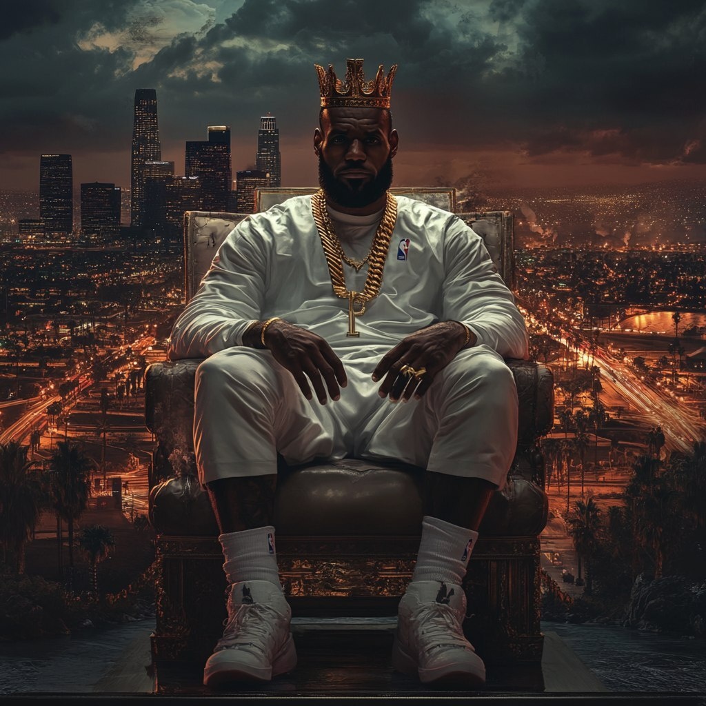 Создано на основе запроса: lebron james sitting on a throne chair wearing a crown with la city in background in the style of fantasy