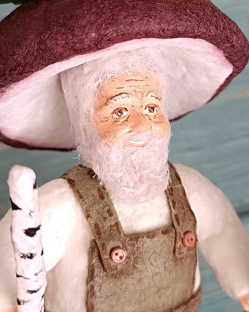 Вот и подобрались мы к голове Старичка! Здесь я решила всё сделать по классике - дедушка должен быть с бородой, но не пышной, как у Деда Мороза, а более скромной. Ведь он - лесной житель, трудяжка, длинные волосы будут ему только мешать))). Поэтому делаем Боровичку аккуратную седую прическу. Работаем с льняной ватой и клейстером. Наращиваем объем волос постепенно, по прядям, начиная с усов и потихоньку двигаясь к низу головы. Не промазываем густо вату, лишь слегка промакиваем кистью, чтобы прикрепить к лицу. Тогда пряди остаются пушистыми и более живыми, реалистичными. Все подробности можно наблюдать в видео, приглашаю к просмотру: Обратите внимание - и рубашку, и бороду я делала из белой льняной ваты. Но отрезы из разных партий и отличаются по оттенку. Рубашка вышла светлой, белой, а вот борода и волосы - чуть темнее, уходят в оттенок серого, поэтому удачно получился этакий седой цвет, с серебринкой))). Спасибо за просмотр, завтра продолжим желать нашего Боровичка еще краше🤗🤗🤗!