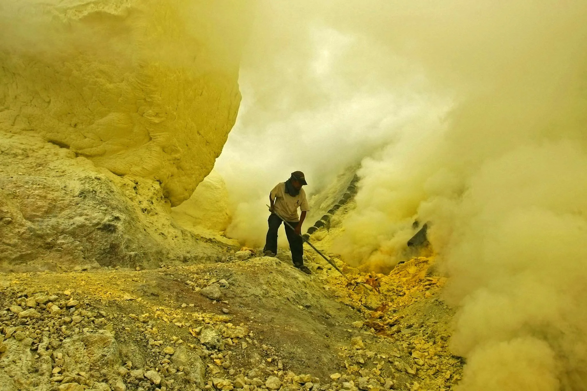 Иджен в Восточной Яве — не просто вулкан, а место, где природа показывает свой самый суровый нрав. В его кратере — озеро Кавах, самое кислотное в мире (pH 0,5, как кислота в аккумуляторе). Его бирюзовая вода кипит у дна при 200 °C, а над ней вьётся сероводород, который ночью горит синим пламенем — завораживающим, но смертельным.