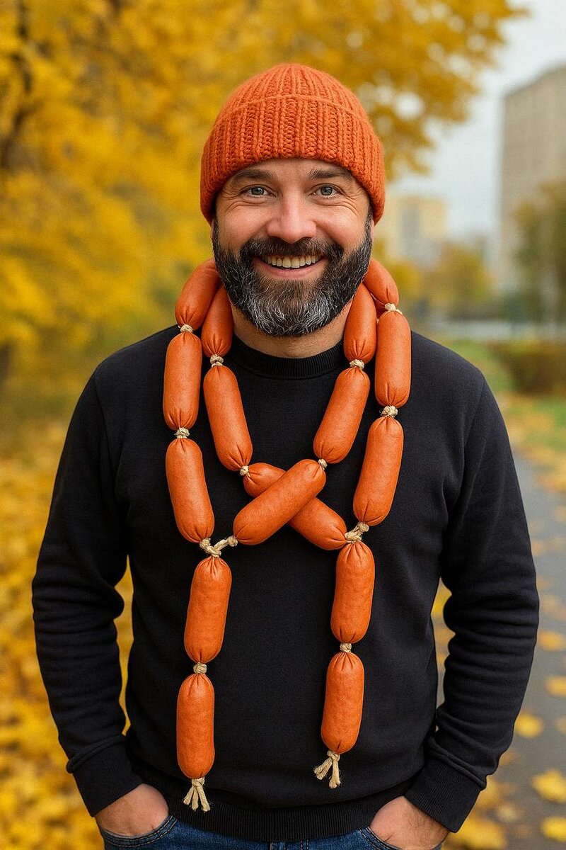 ШАРФ-СОСИСКА: ПАПА ВЯЖЕТ 😂 Ну что, Друзья, в моду ворвались сосиски! И не в тарелку на завтрак с яичницей, а на шею. Бренд Your Antihero презентовал шарф в виде связки сосисок. 210 сантиметров креатива, сделан из мягкого бамбукового волокна. Шарф уже окрестили «идеальным подарком для вегана». Хм…) А почему бы и нет?. Хочешь, вяжи себе классический шарф польской резинкой, хочешь - делай связку сосисок или колбасок! Главной в удовольствие, и с аппетитом! Даже интересно как будет выглядеть шарф, например в виде кофейных зерен, или хинкалей 😂, пойду попрошу ИИ отрисовать, попозже покажу!