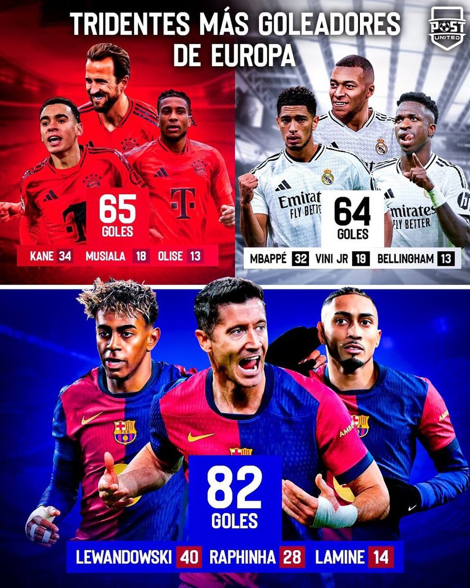 🇪🇸🇩🇪🇪🇸Самые забивные трио Европы в этом сезоне... Игроки Барсы сильно впереди всех остальных: Левандовски - 40 Рафинья - 28 Ямаль - 14 Всего: 82 гола во всех турнирах забила только эта тройка
